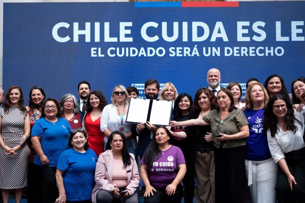 «Al promulgar la ley de Chile Cuida, quiero reconocer a todas las personas, principalmente mujeres, que cuida en el país, que están en todas partes, en todas partes, y muchas veces no se ven, pero ahí están y nos sostienen”, destacó el mandatario.