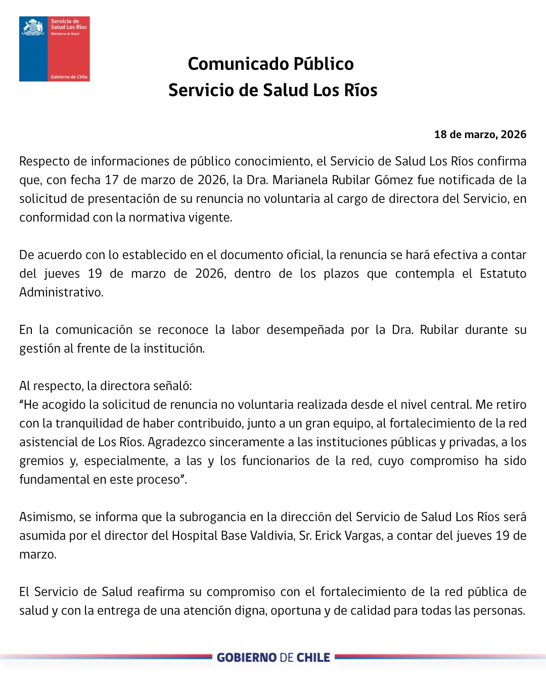 En este contexto, se confirmó la solicitud de renuncia no voluntaria a la directora del Servicio de Salud Los Ríos, Dra. Marianela Rubilar Gómez, quien fue notificada el pasado 17 de marzo de 2026, de acuerdo con lo informado mediante un comunicado público de la propia institución.