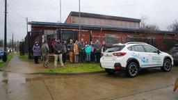 El vehículo Subaru 4×4 fue recibido con una cortina de agua de parte de Bomberos de Pichirropulli y contó con la bendición del diácono Alejandro Martínez. |